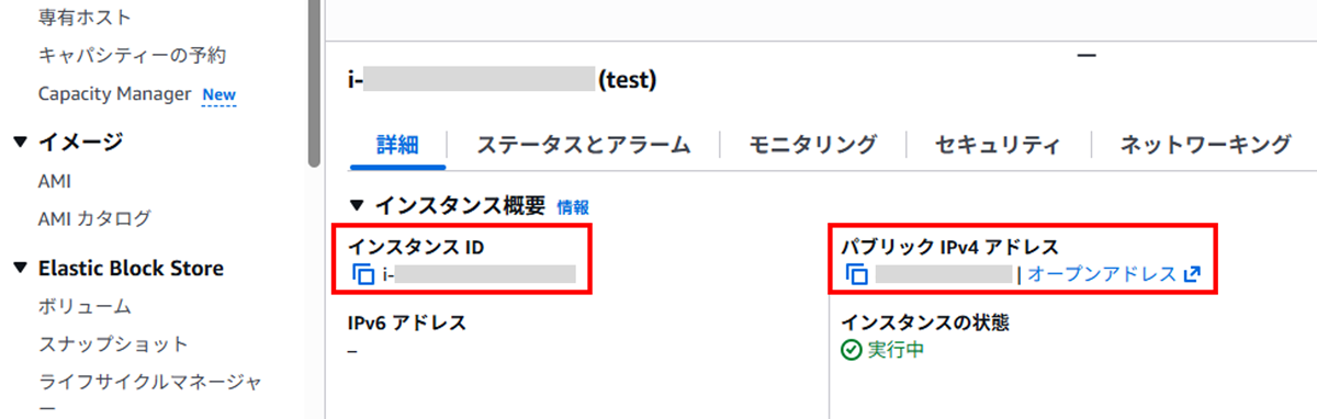 4. [パブリック IPv4 アドレス] [インスタンス ID] を確認します。