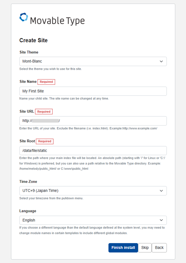 5. 「Create Site」画面で各項目を入力して、[Finish install] をクリックします。