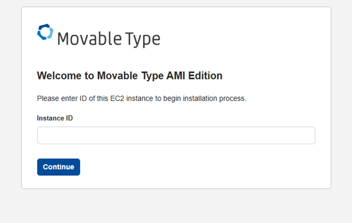 3. 「Welcome to Movable Type AMI Edition」画面でインスタンス ID を入力し、[Continue] をクリックします。