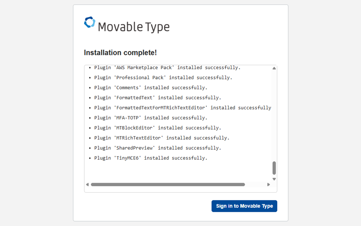 6. 「Initializing database...」画面が表示され、データベースの設定が自動的に行われます。設定が完了したら、[Sign In to Movable Type] をクリックします。